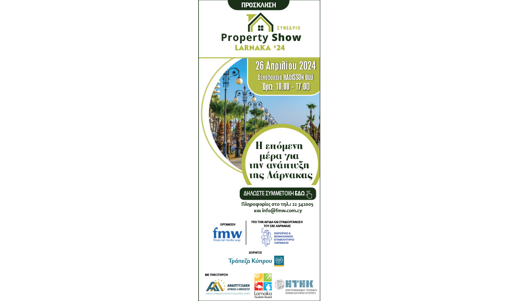 Το Εμπορικό και Βιομηχανικό Επιμελητήριο Λάρνακας τελεί υπό την αιγίδα του το 6ο Property Show Larnaka ‘24 με θέμα «Η Επόμενη μέρα για την Ανάπτυξη της Λάρνακας». Το Συνέδριο οργανώνεται από την εταιρεία FMW με τη στήριξη της Εταιρείας Τουριστικής Ανάπτυξης (ΕΤΑΠ) Λάρνακας, την Αναπτυξιακή Εταιρεία Λάρνακας – Αμμοχώστου, και του ΕΤΕΚ και θα πραγματοποιηθεί την Παρασκευή 26 Απριλίου και ώρα 10:00 – 17:00 στο ξενοδοχείο Radisson Blu στη Λάρνακα.